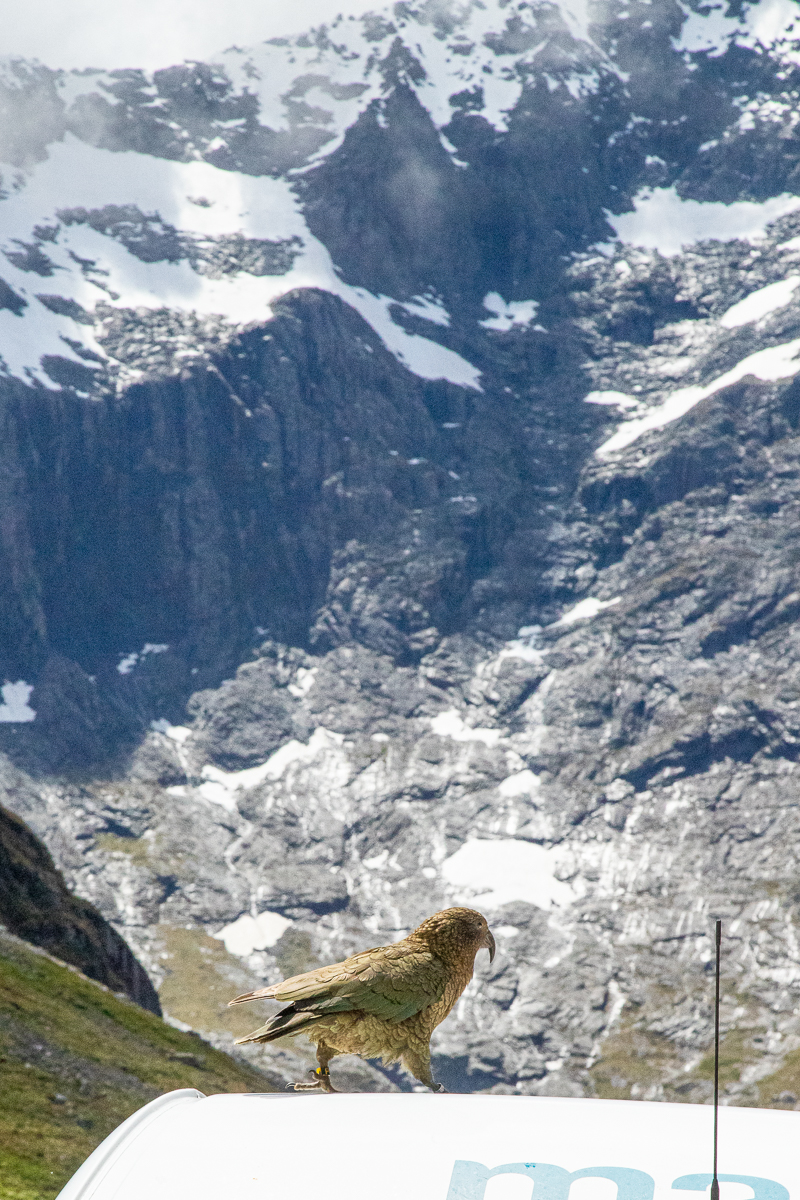 Driving to Milford Sound was how we spent our third day, and even after doing a fly over and a cruise back in June, was our favorite way to experience Milford Sound. We had another run in with a cheeky Kea. At this point I feel it goes without saying that kea’s are cheeky little trouble makers. Frequently described as naughty toddlers, they are smart as a whip and do not like being told what to do, and often explore destructively with their beaks. We had one play with us and the cars around us as we waited to cross the famous Milford Sound Tunnel.